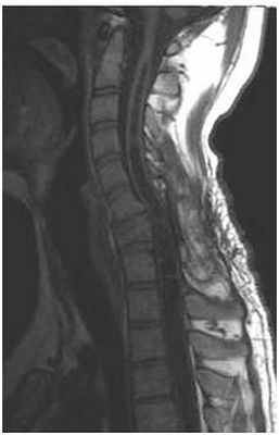 МРТ изображение (T1-взвешенное изображение) пациента с тяжелым повреждением спинного мозга и шейного отдела позвоночника (С7) в результате «травмы ныряльщика». Обратите внимание на полость (темная полоска в середине спинного мозга), которая простирается кверху и книзу от уровня повреждения. Сразу после травмы у пациента развилась слабость в ногах, а впоследствии возникла слабость в руках из-за сирингомиелии.