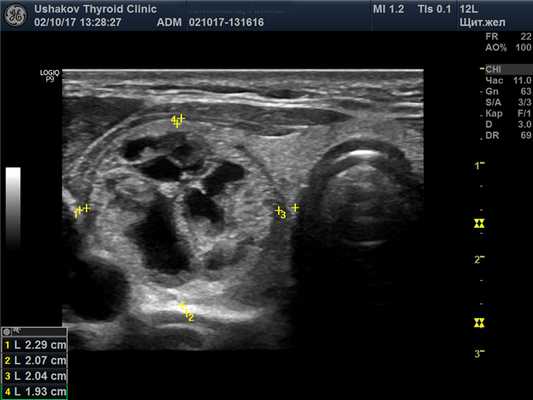 - При многоузловом зобе (МУЗ) УЗИ позволяет идентифицировать рак щитовидной железы; ищите признаки злокачественной опухоли, ± лимфаденопатию