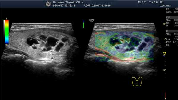 Все признаки узла (в режимах В, ЭДК, ЦДК) в этом примере указывают на доброкачественный процесс. Форма узла приближена к правильной, стремится повторить форму доли. Узел имеет чёткую границу и гипоэхогенный (сосудистый) контур по всему периметру, распределение сосудов и. закономерные изменения внутри. Доброкачественность остаточной ткани подтверждается и при эластографии (SR 2,8).