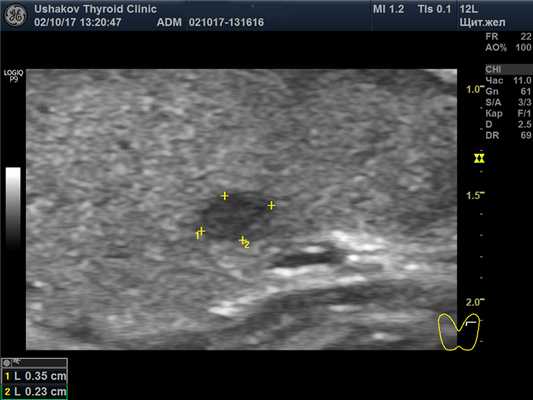 о УЗИ требуется для подтверждения диагноза, контроля иглы при биопсии, оценки экстратиреоидного распространения, выявления злокачественной лимфаденопатии