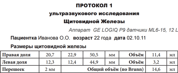 Но ткань расположена ещё и вокруг узла (больше с медиальной стороны). Поэтому разница объёма доли и узла (11,4-7,4) показывает 4 мл, что составляет 35% от величины доли и также указывает на субтотальнодолевой узловой зоб.