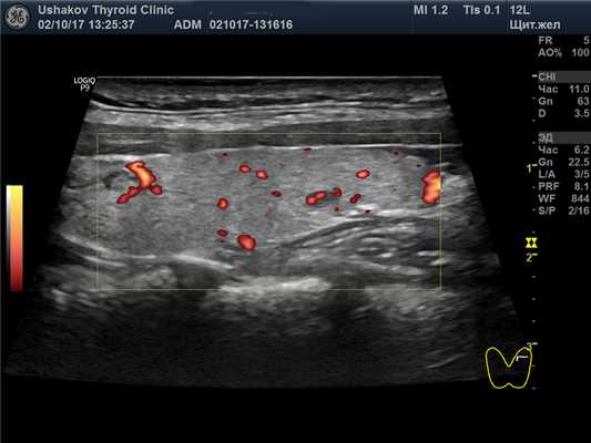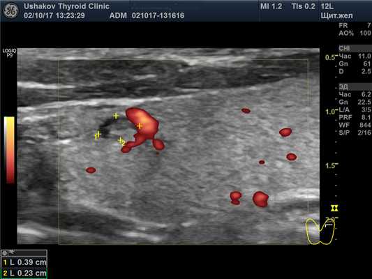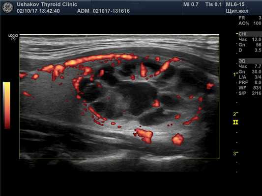 - Повышенная васкуляризация с преимущественным интранодулярным распределением при цветовой допплерографии