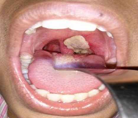 Чаще всего встречается пленчатая форма дифтерии, при которой налет на миндалинах имеет вид плотной пленки с четкими краями. При попытке снять ее шпателем миндалины начинают кровоточить. Горло отекает и очень сильно болит. Чем шире распространен налет, тем больше проявляется интоксикация организма.