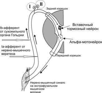 Видно, что проприоцептивное нервное волокно типа 1а, исходящее от мышечного веретена, входит в задний корешок спинного мозга. Затем ветвь этого волокна идет непосредственно к переднему рогу серого вещества спинного мозга и синаптически связывается с передними мотонейронами, которые посылают двигательные нервные волокна к той же мышце, от которой исходят волокна мышечных веретен. Таким образом, существует моносинаптический путь, позволяющий рефлекторному сигналу вернуться с кратчайшей задержкой назад к мышце после возбуждения веретена. Большинство волокон типа II от мышечных веретен заканчиваются на множестве вставочных нейронов серого вещества, и их аксоны проводят сигналы к передним мотонейронам с задержкой или выполняют другие функции.