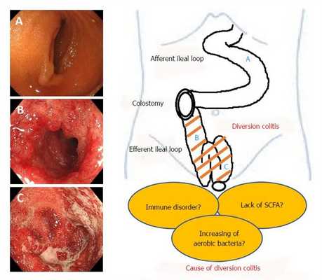 Клиническая картина. Клинические проявления возникают примерно у 30% больных без ХВЗК, но у пациентов с болезнью Крона встречаются в 33% случаев, а при язвенном колите — 87%.[Оэ2] Симптомы диверсионного колита возникают в течение 1–36 месяцев после наложения колостомы [3, 9]. Пациенты с диверсионным колитом жалуются на выделение слизи и/или крови, тенезмы, боли в животе, чувство тяжести или боль в прямой кишке [1, 7]. Патологические выделения из прямой кишки — наиболее распространенный симптом (40%), на втором месте по встречаемости — боли в животе и тенезмы (15%) [9]. Наиболее информативный в этом случае диагностический метод — ректороманоскопия и колоноскопия с гистологическим исследованием биоптата слизистой и удаленных операционных препаратов из отключенных отделов ободочной и прямой кишки [1].