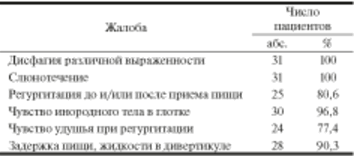 Таблица 1. Частота жалоб у пациентов с дивертикулом Ценкера.