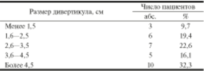 Таблица 2. Характеристика пациентов по размеру дивертикула (данные эндоскопического исследования).