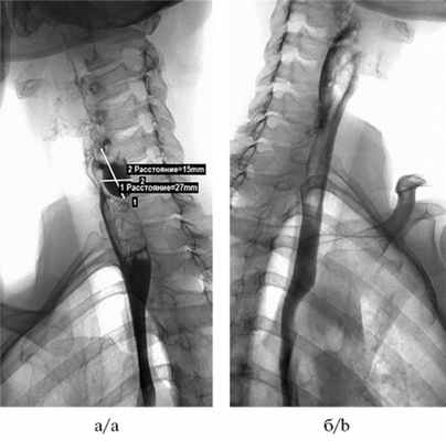 Рис. 3. Рентгеноскопия пищевода до операции: определяется дивертикул с задержкой контрастного вещества в нем (а); проходимость восстановлена, «задержка» контрастного вещества не определяется (б).