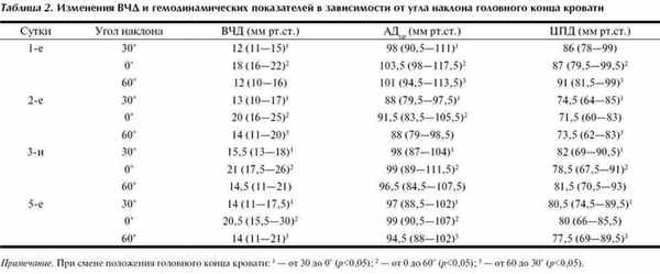 В 1-е сутки от начала заболевания оптимальным следует считать угол 60°, так как именно в этом положении головного конца кровати сохранялся оптимальный мозговой кровоток и не нарастал внутричерепной гипертензионный синдром. На 2-е сутки наиболее благоприятным становился угол 30°, а к 3-м суткам различия значений гемодинамических показателей в положении 30 и 60° исчезали, и оба этих положения являлись оптимальными. На 5-е сутки после оперативного вмешательства предпочтительным вновь становился угол наклона в 30°.