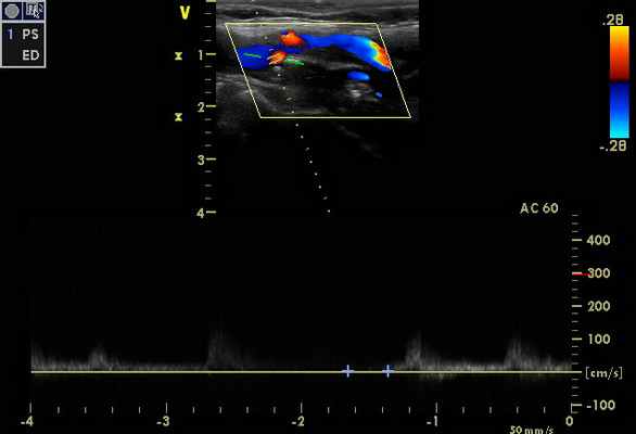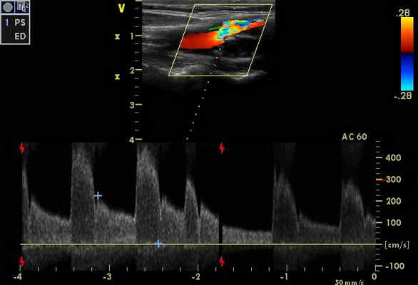 Признаки стенозов в V 2 сегментах позвоночных артерий с обеих сторон - по спектральным характеристикам - 75-85%, (правая ПА - на рис. 3). На рис. 4 – признаки субокклюзии – окклюзии ОСА слева (состояние после стентирования и эндартерэктомии - 2011 г.).