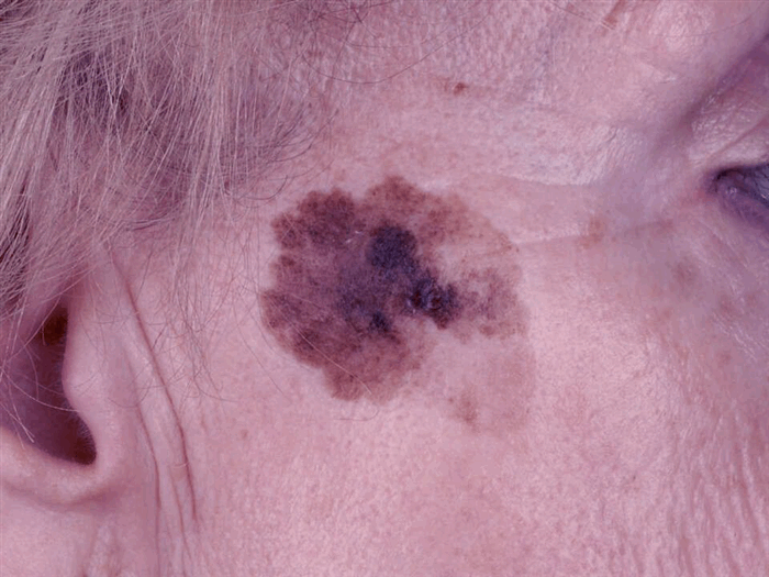б - Появление иссиня-черных опухолевидных образований на фоне существующего в течение 5 лет злокачественного лентиго в области лица.