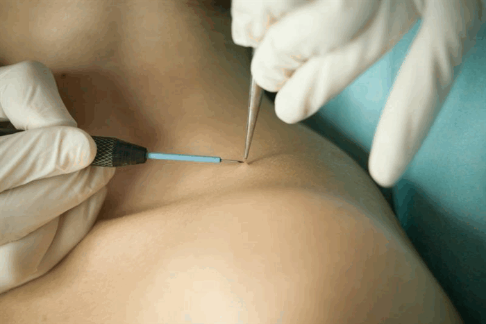 Дерматоскопия позволяет тщательно осмотреть родинку (невус) и изучить ее структуру, цвет, рельеф и границы на глубине до 2-3мм. Оценив потенциальную опасность новообразования, специалист может сделать его снимки с помощью дерматоскопа и при необходимости назначить удаление. Ткань удаленной родинки может быть направлена на биопсию (гистологическое исследование).
