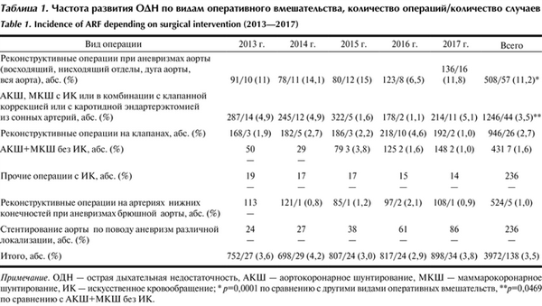Таблица 1. Частота развития ОДН по видам оперативного вмешательства, количество операций/количество случаев Примечание. ОДН — острая дыхательная недостаточность, АКШ — аортокоронарное шунтирование, МКШ — маммарокоронарное шунтирование, ИК — искусственное кровообращение; * р=0,0001 по сравнению с другими видами оперативных вмешательств, **p=0,0469 по сравнению с АКШ+МКШ без ИК.
