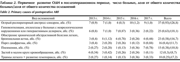 Таблица 2. Первичное развитие ОДН в послеоперационном периоде, число больных, доля от общего количества больных/доля от общего количества осложнений