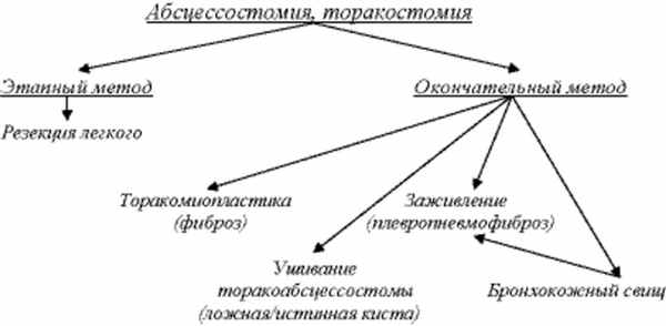 Эти виды открытого дренирования являются как этапными (перед радикальными резекционными вмешательствами), так и окончательными (без резекции легкого) методами с положительным результатом лечения и возможностью последующего выполнения торакопластики, торакомиопластики (рис. 4). Рисунок 4. Дренирующие операции как этапный и окончательный методы лечения. Дренирующие операции нами выполнены 36 больным (торакостомия - 20, абсцессостомия - 16) с достижением клинического эффекта у 31 больного и последующим закрытием абсцессоторакостом у 11 человек.