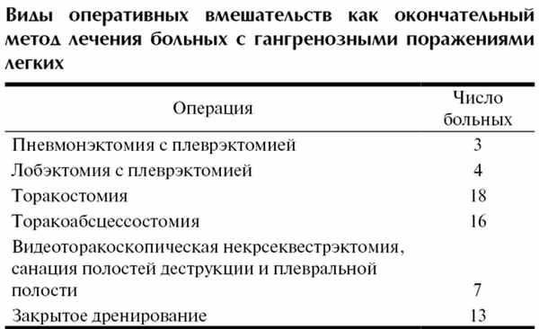 Выбор метода лечения зависит не от формального обозначения процесса в легком (гангренозный абсцесс или гангрена), а от клинического проявления острого легочного нагноения и его течения [5]. Методы лечения гангренозных поражений можно разделить на следующие группы.