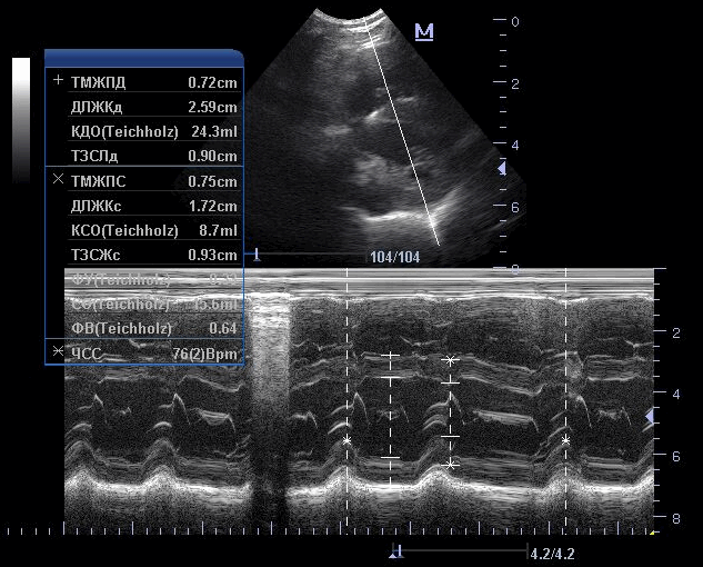 Рис.3. Эхокардиография. М-режим. Измерения параметров