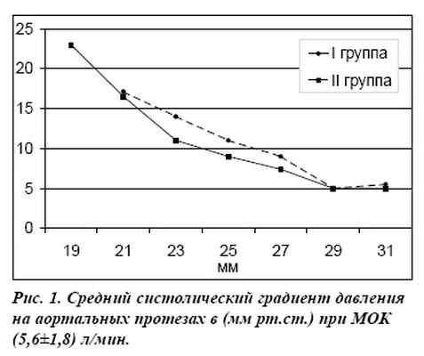 Анализ гемодинамического эффекта протезирования аортального клапана (АК), достоверно свидетельствует об отсутствии различий в сравниваемых группах по величине среднего систолического градиента давления между левым желудочком и аортой на клапанах одинакового типоразмера (р>0,05) (рис. 1). При этом максимальные градиенты давления на протезах составляли 17,1±2,4 и 16,5±2,6 мм рт.сх, для ИКС 21 типоразмера, минимальные - 5,4±1,1 и 5,1±1,3 мм рт.ст., для ИКС 29 типоразмера, соответственно, в I и II группах при минутном объеме кровообращения (МОК) 5,6±1,8 л/мин.