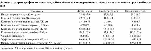 Во всех наблюдениях отмечался выраженный кальциноз аортального клапана (АК), который распространялся на фиброзное кольцо АК и переднюю створку МК. В 22,4% наблюдений кальциноз распространялся на стенку аорты, в 28,2% - на межжелудочковую перегородку или миокард левого желудочка. Пиковый градиент на АК колебался от 46 до 162 мм рт.ст. и в среднем составил 78,6±27,9 мм рт.ст., средний градиент был равен 49,7±16,4 мм рт.ст. (от 35 до 94 мм рт.ст.). Митральная регургитация отмечалась у 89 (82,4%) больных. Регургитация III степени на МК была выявлена у 12 (11,1%) пациентов, II степени - у 53 (49,1%) и I степени - у 24 (22,2%). Показатели предоперационной ЭхоКГ представлены в таблице.