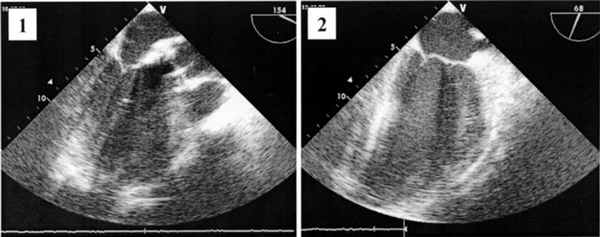 В послеоперационном периоде всем больным выполняли эхокардиографическое исследование. Отмечали достоверное снижение пикового и среднего градиентов давления на АК, что свидетельствует об эффективности хирургической коррекции порока. Пиковый транспротезный градиент после операции равнялся в среднем 17,9±9,2 мм рт.ст. (от 10 до 34 мм рт.ст.). Функция МК признана удовлетворительной у всех больных. Улучшилась подвижность передней створки МК (рис. 2). Рисунок 2. Эхокардиограммы. 1 - до операции; 2 - после операции. Регургитация на МК не превышала I-II степени. У 14 (12,9%) пациентов отмечалась регургитация II степени, у 51 (47,2%) - I степени. Длительность искусственного кровообращения составила в среднем 105,4±27,7 мин (от 54 до 225 мин), продолжительность пережатия аорты - 81,4±24,5 мин (от 39 до 183 мин). Динамика эхокардиографических показателей представлена в таблице.