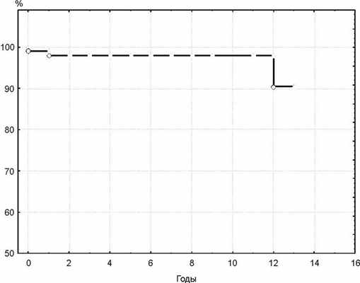 Отдаленные результаты прослежены у 91 (84,3%) больного. Максимальный срок наблюдения 13 лет. В отдаленные сроки умерли 3 больных (через 2 мес, 18 мес и 12 лет после операции). Причиной смерти 2 больных в отдаленном периоде наблюдения был тромбоэндокардит протеза, причина смерти 1 пациента не известна. Общая выживаемость с учетом госпитальной летальности к 1, 6 и 13 годам наблюдения составила 98, 98 и 90% соответственно. Кривая выживаемости больных, построенная с помощью метода Каплана-Мейера, представлена на рис. 3. Рисунок 3. Выживаемость больных с учетом госпитальной летальности.