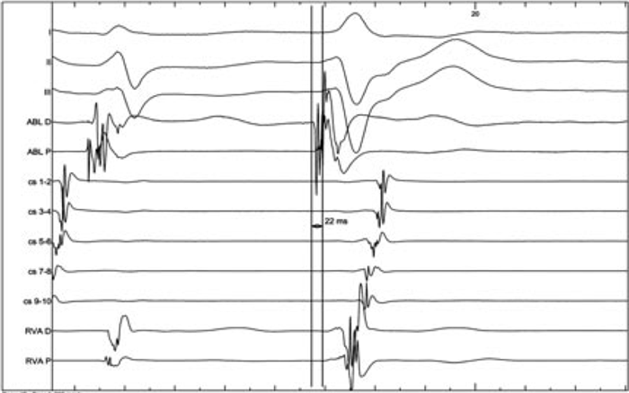 Рис. 2. Активационное картирование желудочковой экстрасистолии. Опережение на дистальной паре аблационного электрода составляет 22 мс. Видна фрагментированная активность с аблационного электрода в найденной ранней точке, являющаяся предиктором успешной радиочастотной аблации. Скорость записи 200 мм/с (I, II, III – стандартные отведения ЭКГ; ABLD и ABLP – биполярные эндограммы с аблационного электрода; CS 1–10 – биполярные эндограммы с катетера, установленного в коронарный синус; RVAD, RVAP – эндограммы с катетера, установленного в правом желудочке).