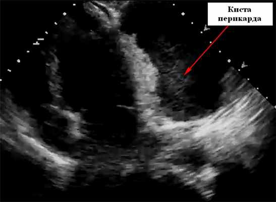 На УЗИ кисты перикарда необходимо дифференцировать от локализованного выпота в перикарде, увеличения камеры сердца, диафрагмальной грыжи и злокачественных опухолей. Двумерная эхокардиография может легко отличить анэхогенное содержимое перикардиальной кисты от солидных структур. Типичное расположение кист перикарда в правом сердечно-диафрагмальном угле является еще одним ключом к разгадке, хотя они также могут быть обнаружены в левом сердечно-диафрагмальном углу, воротах и верхнем средостении.