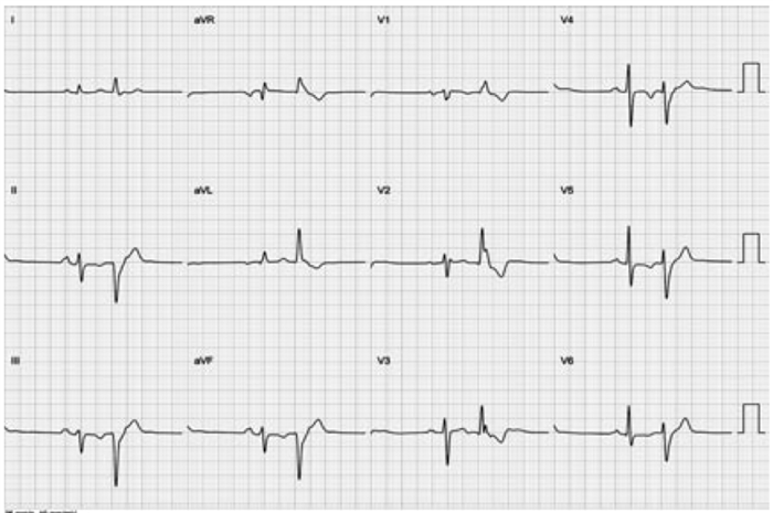 Рис. 1. ЭКГ в 12 отведениях. Вторые комплексы в каждом из отведений являются экстрасистолическими. Скорость записи 25 мм/с.