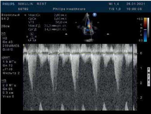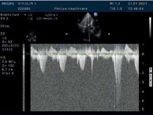 Рис. 3. В-режим + CW-режим. Апикальная 5-камерная позиция. Исследование кровотока в ВТЛЖ при поведении пробы Вальсальвы. Прирост систолического градиента, максимальный систолический градиент 82,8 мм рт.ст.