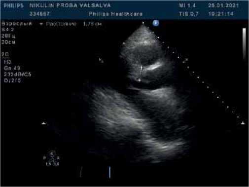 Рис. 1. В-режим. Парастернальная позиция по длинной оси ЛЖ. Асимметричная гипертрофия миокарда ЛЖ с утолщением миокарда в базальном сегменте.