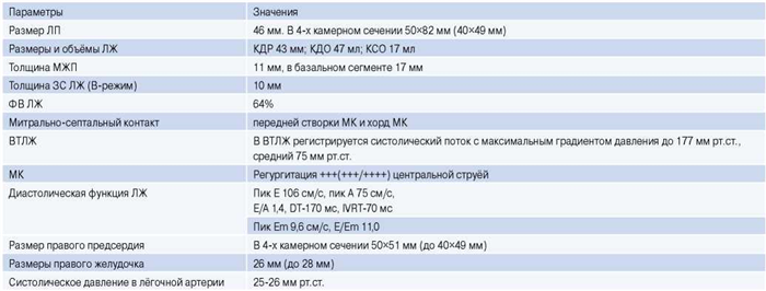 Сокращения: ВТЛЖ — выходной тракт левого желудочка, ЗС — задняя стенка, КДР — конечный диастолический размер, КДО — конечный диастолический объем, КСО — конечный систолический объём, ЛЖ — левый желудочек, ЛП — левое предсердие, МЖП — межжелудочковая перегородка, ФВ — фракция выброса.