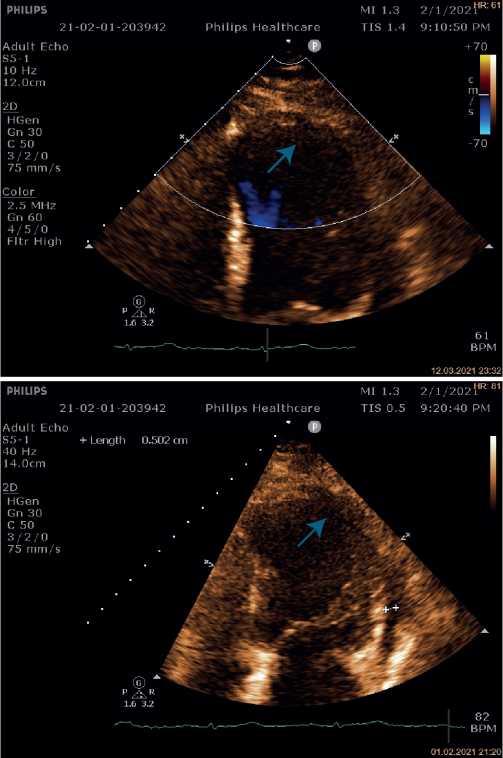 Отмечалось незначительное увеличение полости левого предсердия в отсутствие увеличения полостей правого и левого желудочков, а также повышенная сократительная способность миокарда левого желудочка (ЛЖ) без признаков нарушения локальной сократимости миокарда, глобальная фракция выброса ЛЖ достигала 65% (рисунок 3).