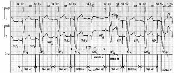 Единичные неэффективные стимулы ЭКС во время нанесения ЭК были выявлены у 2 (2,0%) больных. На рис. 3 Рисунок 3. Двухкамерный режим стимуляции (DDD) с базовой частотой стимуляции 70 имп/мин (860 мс). Интервал гистерезиса - не активирован. Стимулы монополярные: StP - предсердный, StV - желудочковый. В момент воздействия ЭК нарушение стимулирующей функции ЭКС по желудочковому каналу. Пауза до 1726 мс за счет выпадения желудочкового комплекса. Коагуляционные помехи - Мм. Стм. - канал ЭКС. Скорость записи 25 мм/с, усиление 1мВ=10 мм (объяснение в тексте). - двухкамерный режим стимуляции DDD. StР1-StР9 - эффективные предсердные стимулы. StV1-StV4, StV6-StV9 - эффективные желудочковые стимулы. Желудочковый StV5 не вызывает возбуждения миокарда (пауза длительностью 1726 мс).