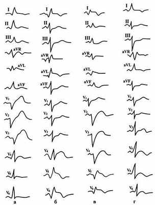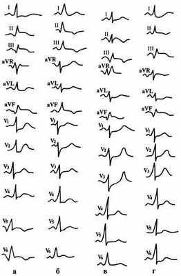 а) наибольшие трудности связаны с блокадой ЛНПГ и ее ветвей. Признаки переднего инфаркта миокарда обычно нивелируются при полной блокаде ЛНПГ. В этих случаях в диагностике могут помочь изменения сегмента ST и зубца Т во времени, а также наличие QS, QR в V4. Эта блокада также может маскировать и признаки нижнего инфаркта миокарда. Если инфаркт миокарда распространяется на межжелудочковую перегородку, то тогда в III, II, aVF отведениях может появиться зубец q;