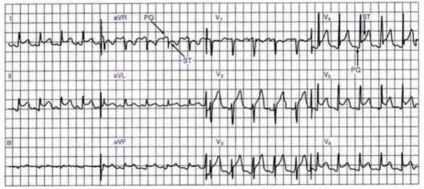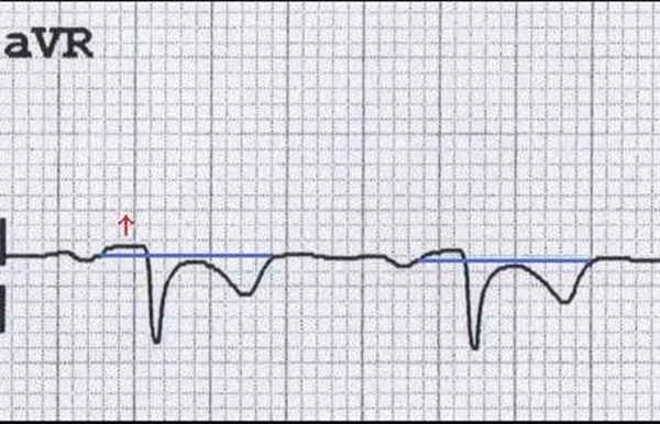Элевация сегмента ST над изолинией во многих отведениях (кроме III, aVR и V1). Депрессия сегмента PQ (т.е. волны реполяризации предсердий, обычно накладывающуюся на сегмент PQ и комплекс QRS)