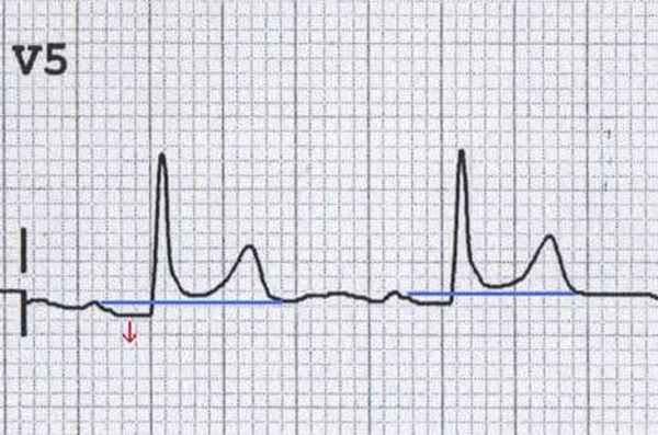 Сегмент P-R — это плоский, обычно изоэлектрический сегмент от конца зубца P до начала комплекса QRS. На изображении предмтавлен фрагмент ЭКГ с депрессией сегмента PR в V5 при остром перикардите (обратите внимание также на некоторое вогнутое повышение RS).