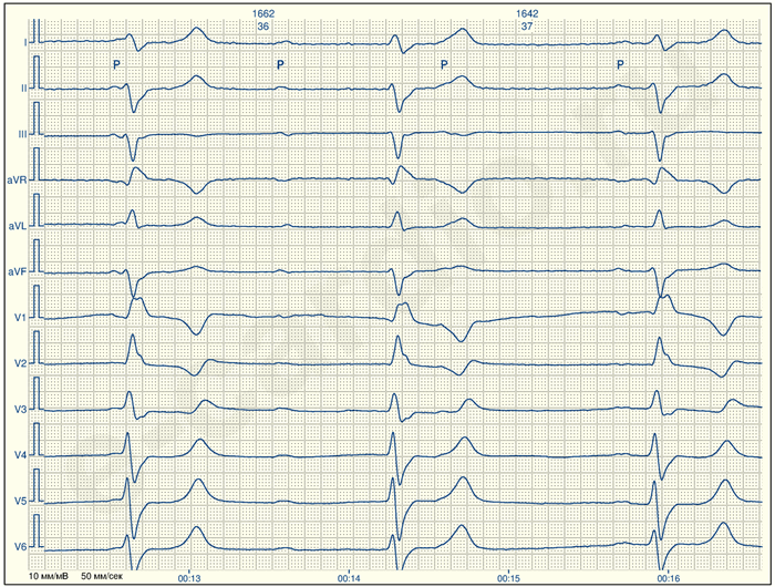 Комплексы QRS деформированы и уширены более 0,12 с по типу блокады ножки пучка Гиса с соответствующими изменениями реполяризации (дискордантный зубец Т).