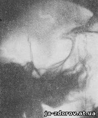 Нередко на рентгенограммах видна тень обызвествленной опухоли, величина которой может быть различной: от мелких очажков до участков значительных размеров. Н. Н. Альтгаузен указывает, что обызвествление опухоли встречается в 74,7% случаев; по данным других авторов, обызвествление наблюдается значительно чаще.