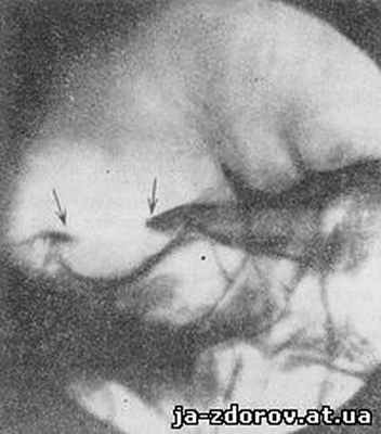 Рис. 75. Супраселлярная опухоль. Увеличение переднезаднего размера турецкого седла, вход в него значительно расширен. Передние и задние клиновидные отростки (указаны стрелками) опущены книзу.