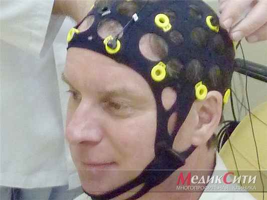 ЭЭГ совершенно безвредна и безболезненна. Во время обследования пациент удобно располагается в кресле. С помощью специального шлема к его голове прикрепляются маленькие электроды, соединенные проводами с электроэнцефалографом. Аппарат в сотни тысяч раз усиливает биопотенциалы, полученные с датчиков, и записывает их в память компьютера.