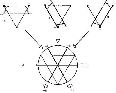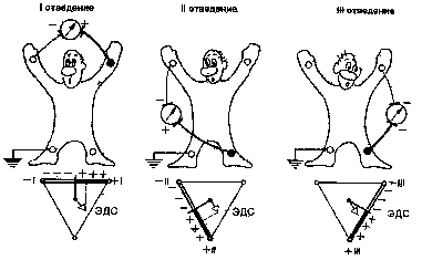 Знаками (+) и (-) здесь обозначено соответствующее подключение электродов к разным полюсам гальванометра (положительному и отрицательному), т. е. указаны положительный и отрицательный полюса каждого отведения.