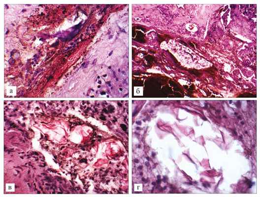 При исследовании плаценты выявили ее краевую отслойку. При микроскопическом исследовании обнаружили частицы ОВ под амниотической оболочкой плаценты, ретроплацентарной гематоме, сосудах матки и сосудах легких (рис. 1), Рис. 1. Частицы околоплодных вод (ОВ) и кровоизлияние под оболочки плаценты. Ув. 400 (а); частицы ОВ в ретроплацентарной гематоме плаценты. Ув. 100 (б); частицы ОВ в сосуде матки. Ув. 400 (в); частицы ОВ в сосуде легкого. Ув. 400 (г). Окраска гематоксилином и эозином. причем в каждом гистологическом срезе легких.