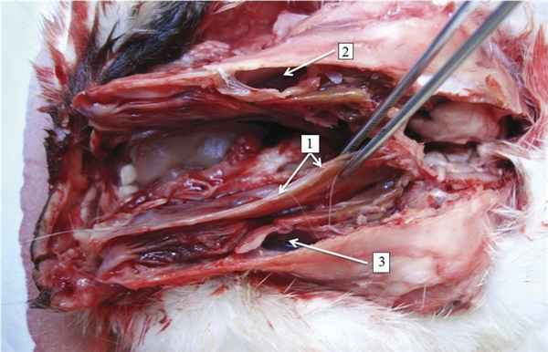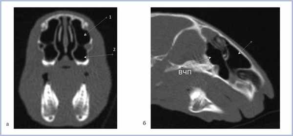 Верхнечелюстная пазуха у кролика делится на 3 широко сообщающиеся между собой полости, располагающиеся одна над другой [2]. С полостью носа верхнечелюстная пазуха сообщается через соустье, расположенное впереди решетчатой кости (рис. 1) [17].