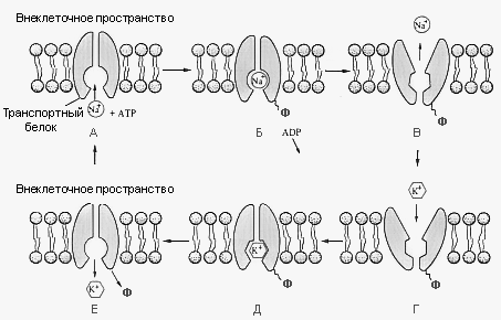 А. Ион натрия в цитоплазме соединяется с молекулой транспортного белка. Б. Реакция с участием АТФ, в результате которой фосфатная группа (Р) присоединяется к белку, а АДФ высвобождается. В. Фосфорилирование индуцирует изменение конформации белка, что приводит к высвобождению ионов натрия за пределами клетки Г. Ион калия во внеклеточном пространстве связывается с транспортным белком (Д), который в этой форме более приспособлен для соединения с ионами калия, чем с ионами натрия. Е. Фосфатная группа отщепляется от белка, вызывая восстановление первоначальной формы, а ион калия высвобождается в цитоплазму. Транспортный белок теперь готов к выносу другого иона натрия из клетки.