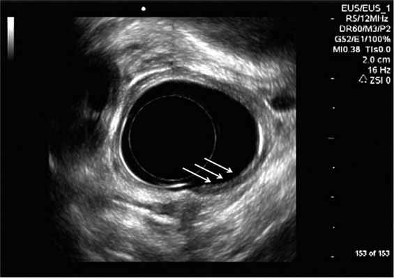 Эндосонография является «золотым стандартом» диагностики эпителиальных и подслизистых образований пищевода. Достоверность метода при стадировании опухоли пищевода по критериям T и N достигает 80 и 77% соответственно [4] и около 95% при определении интрамуральных опухолей или экстраорганного сдавления пищевода патологическими структурами или соседними органами, при дифференцировке происхождения подслизистых новообразований [1].