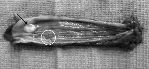 Макропрепарат (рис. 3): Рисунок 3. Макропрепарат ГИСО (стрелка) и изъязвление слизистой в области раковой опухоли пищевода (светлое кольцо). участок пищевода длиной 13 см, на расстоянии 3 см от края резекции определяется язвенный дефект с неровными краями глубиной 0,1 см, дно серого цвета. На разрезе толщина стенки пищевода в области дефекта 0,2 см. На расстоянии 0,5 см от язвы определяется субмукозное образование овальной формы размером 1×0,7×0,4 см, эластичной консистенции, беловатого цвета, подвижное.