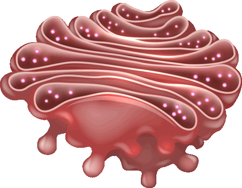 Цитоплазма пронизана сетью мембран, которые образуют энлоплазматический ретикулум (ЭР) и аппарат Гольджи. ЭР представлен непрерывным лабиринтом, состоящим из складчатых мембран, являющихся продолжением наружной ядерной мембраны. ЭР бывает двух типов, которые являются частью одной и той же мембранной системы. На шероховатом ЭР расположены рибосомы — мелкие частицы, на поверхности которых происходит синтез белка, тогда как на гладком ЭР рибосомы отсутствуют.