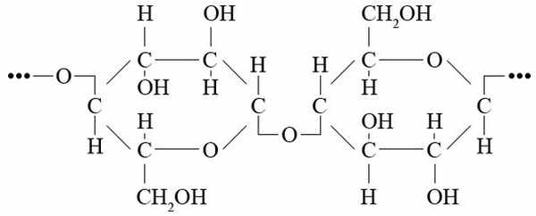 Клетчатка составляет более 50% древесины, а в волокне хлопчатника — более 90%. Структурная формула молекулы целлюлозы имеет такой вид:
