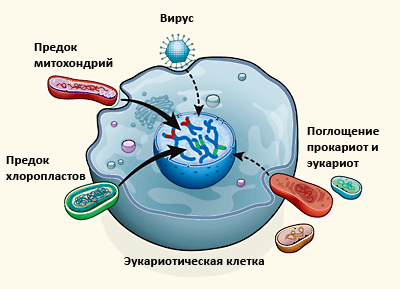 Предполагается, что в какой-то момент в отдаленном прошлом некая прокариотическая клетка (возможно, архея) поглотила бактерию (возможно, протеобактерию), а затем, в ходе некоего магического скачка, заменяющего любое научное объяснение, сотни генов были каким-то образом «перекроены» для выполнения новых функций. Кроме того, считается, что многие тысячи генов были перемещены в клеточные ядра, тогда как другие были отбракованы. Базовые идеи всего этого сценария были выдвинуты в результате обнаружения генов как в геноме митохондрий, так и в геноме эукариотов, в которых некоторые участки имеют сходство с генами бактерий (в особенности протеобактерий). 3