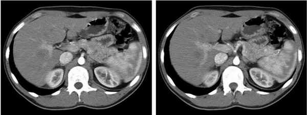 УЗИ: в области перешейка и тела ПЖ обнаружено 5 опухолей диаметром от 12 до 5 мм. Эндоскопическая ультрасонография радиальным датчиком: в области перешейка ПЖ - опухоль диаметром 16 мм, в теле и хвосте - опухоли диаметром 9 и 8 мм. КТ: гиперденсное образование в теле ПЖ размером 14×11 мм, в головке - 12 мм, два образования в хвосте ПЖ размерами 17 и 12 мм (рис. 1). Рисунок 1. Мультидетекторные спиральные компьютерные томограммы больного К. Множественные инсулиномы в теле (а) и хвосте (б) поджелудочной железы.